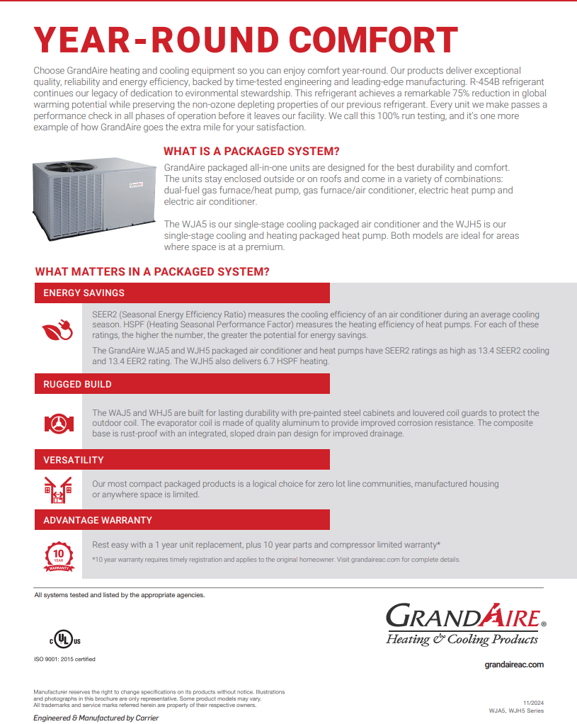 GrandAire WJH524000K000B 2 Ton 13.4 SEER2 Heat Pump Package Unit, 208-230/1/60, R-454B, Single Stage